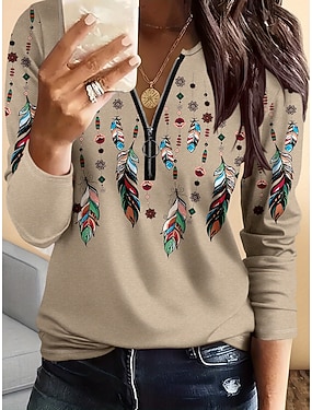 T shirt donna manica lunga grafica piuma elegante vintage elegante manica lunga scollo a V top regolari quotidiani weekend stampa cerniera khaki primavera autunno prefal