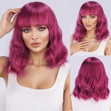 Parrucca Sintetica Ondulato Onda d'acqua Caschetto corto Taglio Scalato Con Frangia Fatto a macchina Parrucca 14 pollici Rosso bordeaux Capelli Sintetici Per donna Classico Confortevole Squisito Rosa