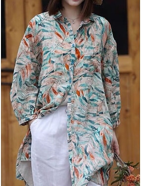 Blusa in lino simile cotone finto per donna bottoni stampa floreale vintage casual maniche lunghe colletto tops lunghi quotidiano blu estate primavera autunno inverno