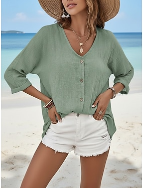 Per donna Camicia Blusa Finto cotone e lino Bottoni Semplice Casual Manica Corta Scollo a V Top Regolari Quotidiano Blu Rosa Viola Verde Cachi Estate