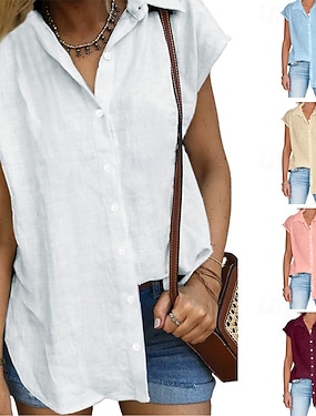 Per donna Maglietta Camicia in finto lino Bottoni Semplice Moda Elegante Classico Senza Maniche Manica Corta Girocollo Top Regolari Quotidiano Uscire Weekend Blu Bianco Rosso Viola Marrone Estate