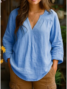 Per donna Camicia 100% cotone Arricciato Semplice Quotidiano Manica Lunga Scollo a V Top Regolari Lavoro Ferie Blu Giallo Rosa Viola Primavera Autunno