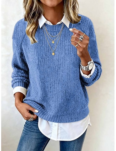 Per donna Felpa Casual Morbido Colore Puro A Coste Girocollo Lavorato a maglia Manica Lunga Top Regolari Maglia All'aperto Quotidiano Weekend Rosa Blu marino Autunno Inverno
