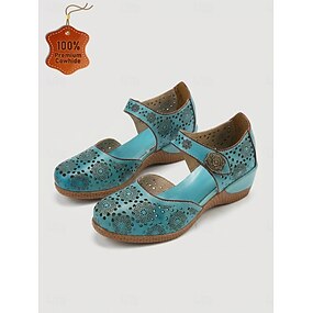 Scarpe basse da donna blu con motivo floreale e intagli – comode ballerine vintage in pelle con cinturino regolabile, perfette per viaggi e feste in giardino. &abbigliamento quotidiano