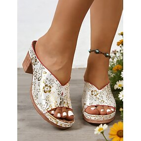 sandali da donna con tacco a blocco, casual, bianchi e floreali - comodi tacchi larghi e slip-on per l'uso quotidiano, passeggiate, viaggi, feste in giardino, lavoro casual &gite del fine settimana