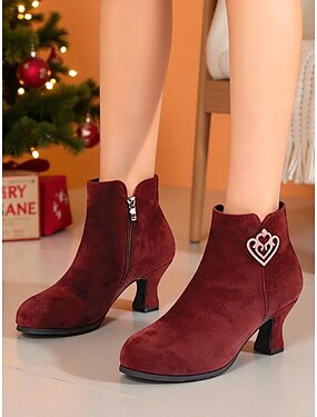 stivaletti da donna in pelle scamosciata bordeaux con decorazioni a forma di cuore e cerniera laterale, stile elegante e festoso, perfetti per Natale, feste di fine anno ed eventi invernali