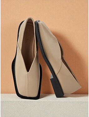 mocassini slip-on beige da donna con punta quadrata - scarpe comode in similpelle con tacco basso e tomaia con taglio a V, stile moderno minimalista per abbigliamento casual, outfit da ufficio e moda