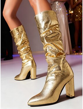 stivali da donna in pelle di serpente color oro a metà polpaccio - stivali da festa alla moda con tacco spesso metallizzato e punta affilata per la sera &abbigliamento da discoteca