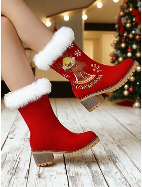 stivali natalizi da donna con renna rossa - stivaletti in pelliccia sintetica con motivo ricamato, scarpe invernali calde e comode per feste e regali