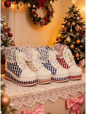 stivali da donna con plateau e lacci a quadretti rossi – adorabile stile retrò con dettagli in pizzo e motivo a quadri per Natale, Lolita e festività invernali