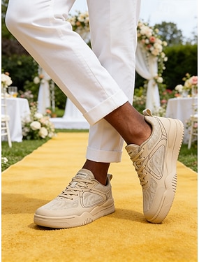Sneakers casual da uomo beige per matrimoni: scarpe comode, traspiranti e leggere, ideali per matrimoni all'aperto, ricevimenti e per l'estate.