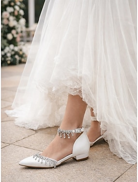 scarpe da sposa con tacco a spillo in raso bianco con cinturino alla caviglia e cristalli per la sposa