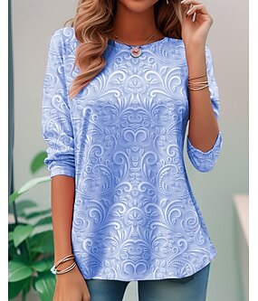 T shirt da donna a maniche lunghe con scollatura a girocollo tunica lunga stampa 3D floreale elegante vintage top regolari quotidiani uscita weekend stampa perla precaldo