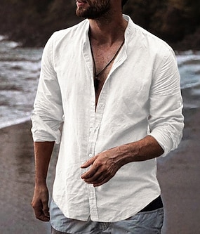 Per uomo Classico Maglietta da spiaggia Maglietta informale Taglio standard Manica lunga Bavero Tinta unica Cotone Lino Bianco Beige Grigio 2025