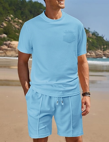 Per uomo Camicia a nido d'ape Completi T-shirt Outfit 2 pezzi Maglietta e pantaloncini Manica Corta Girocollo Estate Semplice Moda Casual Tasca 2 Pezzi Vacanza Abbigliamento quotidiano Uscire Nero