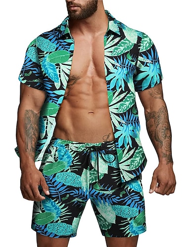 Per uomo Floreale Foglie Piante Tropicali 2 pezzi Set di camicie Camicia hawaiana estiva Manica Corta Pantaloni corti Collo ripiegato Tropicale Moda Hawaiano Streetwear Casuale Camicia hawaiana