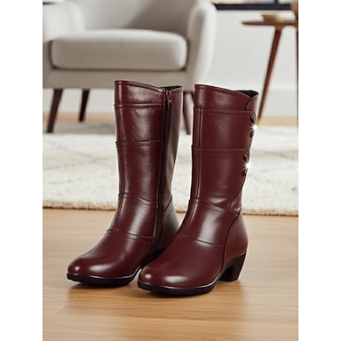 stivali da donna marroni a metà polpaccio con tacco basso e cerniera laterale, comode scarpe casual in pelle per l'uso quotidiano, lavoro &outfit autunno inverno