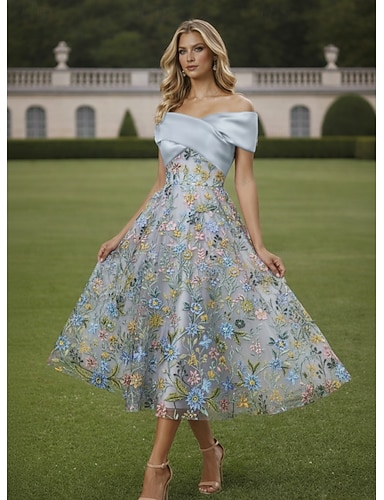 Linea ad A Lunghezza alla caviglia Lunghezza Tè Abiti da Cocktail Elegante Vintage Floreale Manica Corta Senza Spalle Festa in giardino Matrimonio Tasca Raso Pizzo con Stampa floreale Fiore ricamato