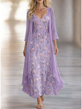 Per donna Insieme del vestito Abito a trapezio Elegante Vacanza Floreale Grafico Stratificato Stampato Abito maxi Manica 3/4 Scollo a V Quotidiano Vacanza Rosa Viola Arancione Estate Primavera