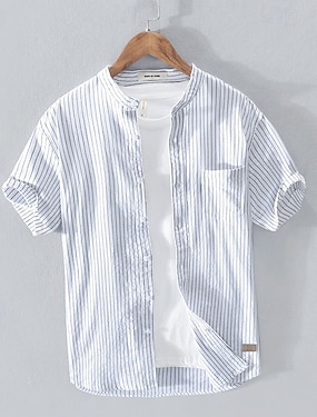 Per uomo Camicia Camicia di lino Camicia casual Camicia con Bottoni Camicia di cotone A righe Vacanza Streetwear Bianco Vino Blu reale Manica Corta Colletto alla coreana Estate Abbigliamento Bottonato