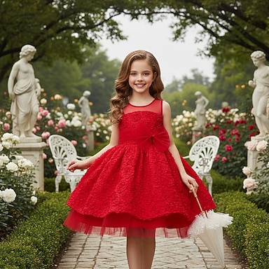Abito da damigella d'onore bambina Ragazze Abito formale Abiti da sposa Feste Matrimonio Formale Elegante Moda Principessa Rete Tinta unica Senza Maniche A V Rosa Rosso Dai 4 anni in su
