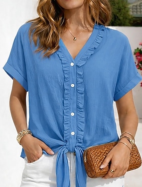 Per donna Camicia Camicie di cotone e lino Camicia Estiva Camicia con Bottoni Nodo frontale Volant Patchwork Tinta unica Semplice Vacanza Moda Casual Manica Corta Scollo a V Top Regolari