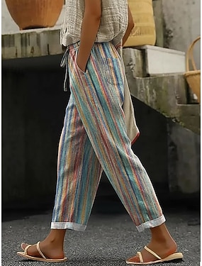 Per donna Finto cotone e lino Pantaloni Eleganti Pantaloni Estivi Casual Lunghezza intera Lunghezza alla caviglia Naturale A righe Geometrico Tasca Stampa Design con Coulisse Elastica Comodo Comodit