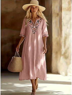 Per donna Abito Midi Vestito Casual Abito in finto lino Elegante Moda Moderno All'aperto Vacanza Uscire Vestibilità regolare Floreale Mezza Manica Scollo a V Rosa Estate Primavera