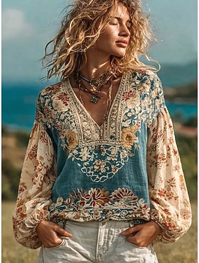 Blusa Boho da Donna in Lino Leggera Traspirante Grafica Floreale Elegante Bohemia Vintage a Maniche Lunghe V Neck Top Regolari Giornalieri Festivi Patchwork Bottoni Stampa Blu Bianco Rosa Azzurro