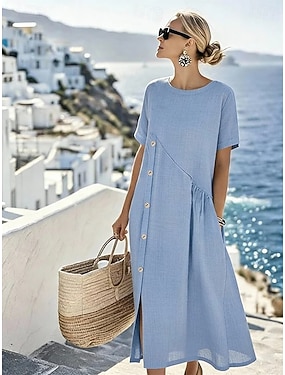 Per donna Abito Midi Finto cotone e lino Abito a trapezio Casual Quotidiano Vestibilità regolare Semplice Manica Corta Scollo a V Blu Nero Bianco Vino Estate Primavera