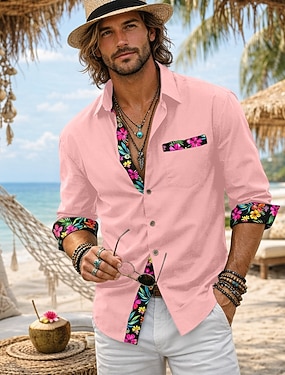 camicia da uomo, camicia di lino, camicia estiva, abbigliamento da spiaggia, camicia con bottoni, floreale, casual, quotidiano, boho, nero, bianco, rosa, grigio, manica lunga, risvolto, estate,