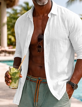 Per uomo Camicia camicia di lino Camicia in lino e cotone Camicia in cotone bianco Camicia estiva Camicia da spiaggia Liscio Hawaiano Per eventi Bianco Manica lunga A V Primavera & Autunno