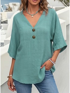 Per donna Camicie di cotone e lino Blusa Finto cotone e lino Bottoni Orlo asimmetrico Semplice Attivo Elegante Manica 3/4 Manica a Campana Scollo a V Top Regolari Quotidiano Ferie Uscire Blu Giallo
