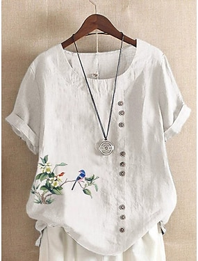 Blusa in lino simile cotone finto per donna stampa floreale stilosa casual maniche corte collo rotondo tops lunghi quotidiano bianco rosa blu navy marrone verde estate primavera
