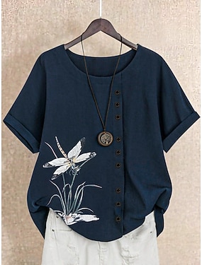 Per donna Taglie Forti Maglietta Finto cotone e lino Bottoni Animale Casual Manica Corta Girocollo Top Regolari Quotidiano Blu Reale Primavera Tutte le stagioni