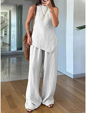 Da donna Misto cotone Set ispirati al lino Set da due pezzi Senza Maniche Girocollo Tinta unica Angosciato Nero Bianco Giallo Estate Vestibilità comoda