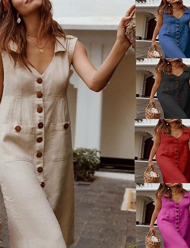 Per donna Abito maxi Finto cotone e lino Abito a Tubino Vestito Estivo Vestito Canotta Elegante Casual Senza maniche Vestibilità regolare Semplice Senza Maniche Scollo a V Cammello Verde militare Blu
