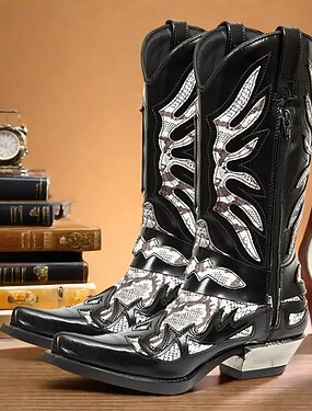 stivali da cowboy gotici da uomo - stivali western in similpelle di serpente nera e argento con design a fiamme e tacco in metallo per eventi rock, motociclisti e feste