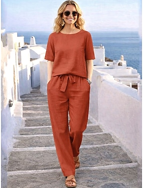 Per donna Set di Pantaloni Bolero Finto cotone e lino Manica Corta Girocollo Tinta unica Moda Streetwear Casuale Quotidiano All'aperto Blu Arancione Verde Estate Vestibilità comoda
