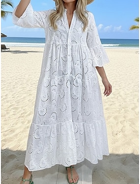 Abito lungo da donna in cotone 100% effetto lino abito a trapezio casual quotidiano vestibilità ampia tinta unita maniche 3/4 V collo Bianco Estate Primavera Autunno