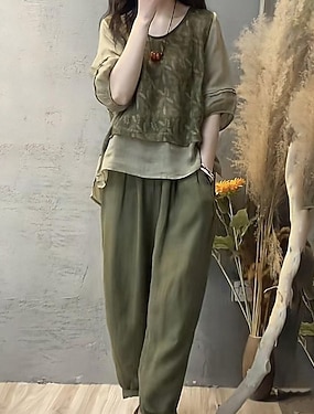 Per donna Blusa Set di Pantaloni Finto cotone e lino Manica 3/4 Girocollo Stampa Patchwork Attivo Moda Ferie Weekend Verde militare Estate Vestibilità regolare