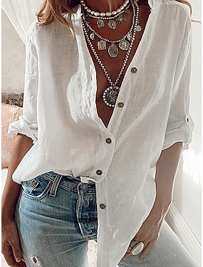 Per donna Top Lungo in Cotone Top Bianco in Cotone Blusa Bianca in Cotone Finto cotone e lino Bottoni Tinta unica Moda Scollo a V Quotidiano Streetwear Blu Bianco Rosa Rosso Fucsia Primavera & Autunno