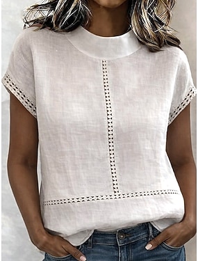 Per donna Blusa Camicia di cotone Finto cotone e lino Traforato Tinta unica Quotidiano Elegante Essenziale Manica Corta Collo alla coreana Top Regolari Quotidiano Bianco Estate Primavera
