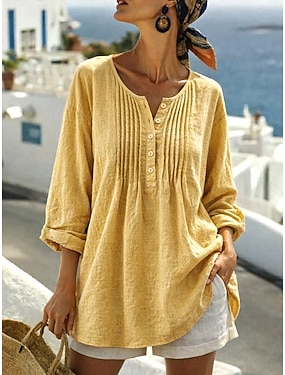 Per donna Camicie di cotone e lino Blusa Tinta unica Quotidiano Elegante Essenziale Manica Lunga Girocollo Top Regolari Quotidiano Nero Bianco Giallo Rosa Blu marino Estate Primavera Autunno