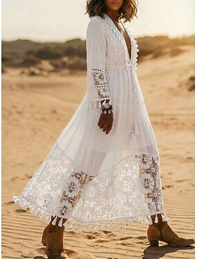 Per donna Abito maxi Abito Boho Abito in Pizzo Abito Bianco Abito Estivo Elegante Moda Spiaggia Vacanza Ferie Vestibilità comoda Semplice Manica 3/4 Scollo a V Blu Bianco Giallo Estate Primavera