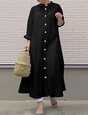 Per donna Abito Lungo Maxi Abito Finto cotone e lino Abito Camicia Vestito Casual Elegante Moda Moderno Quotidiano Vacanza Uscire Vestibilità comoda Semplice Manica Lunga Collo alla coreana Nero