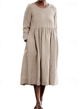 Abito maxi in cotone e lino da donna Abito a linea Abito casual Quotidiano Vestibilità ampia Panna Maniche lunghe V collo Nero Bianco Giallo Verde militare Estate Primavera Autunno