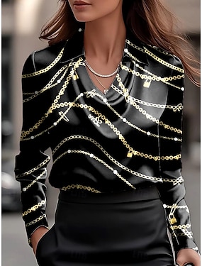 Per donna Camicia Grafico Geometrico A righe Elegante Essenziale Casual Manica Lunga Scollo a Cascata Scollo a V Top Regolari Lavoro Abbigliamento da sera Quotidiano Arricciato Drappeggiato Nero