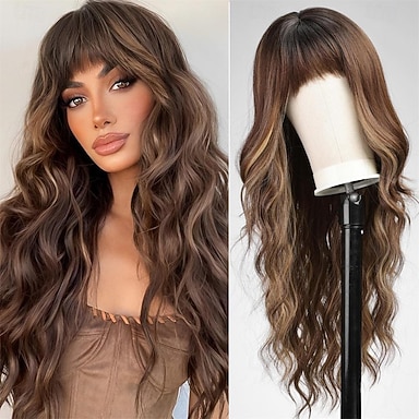 Parrucca ondulata lunga marrone con riflessi per le donne Parrucca ondulata riccia con parte centrale Parrucca in fibra sintetica resistente al calore dall'aspetto naturale per l'uso quotidiano nelle