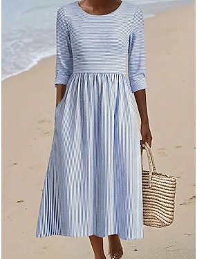 Per donna Abito Midi Vestito Casual Abito in cotone Moda Moderno All'aperto Vacanza Ferie Vestibilità regolare A righe Manica 3/4 Girocollo Azzurro Estate Primavera
